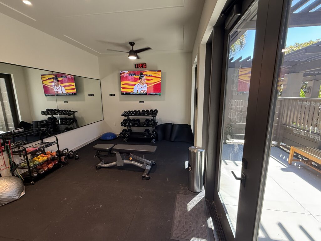 Access details are important: the fitness room is located at the Pavilion and uses a separate keyless lock from the Pavilion’s main entry. You’ll first enter through the Pavilion gate, and then use the fitness room’s keyless entry for the workout space itself.